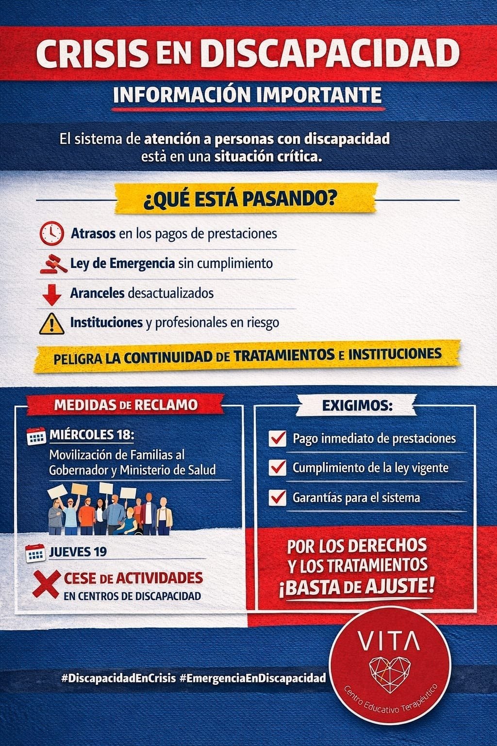 La situación del sistema de atención a personas con discapacidad en San Luis ha llegado a un punto límite, motivando una nueva jornada de protesta para este miércoles 18 de marzo a las 11:00. Centros terapéuticos, hogares y familias autoconvocadas se concentrarán frente al Ministerio de Salud y la sede de Gobierno tras una reunión con funcionarios de la gestión de Claudio Poggi que no arrojó soluciones concretas a la problemática. A través de una desesperada carta abierta dirigida al Gobernador, los afectados denunciaron que la falta de actualización de aranceles y la mora crítica en los pagos han puesto a las instituciones al borde del cierre definitivo, dejando a los profesionales trabajando sin cobrar y arriesgando la continuidad de tratamientos esenciales. Los reclamos incluyen la creación de un fondo de emergencia provincial, la equiparación con subsidios educativos y la exención de impuestos para garantizar que los centros, que funcionan como el único sostén terapéutico y social ante la ausencia de alternativas estatales, puedan seguir operativos. Además de la movilización, se ha anunciado un cese total de actividades en los centros de discapacidad para el día jueves 19 como medida de fuerza ante un ajuste que, según advierten las familias, condena al abandono total a los ciudadanos más vulnerables de la provincia.
