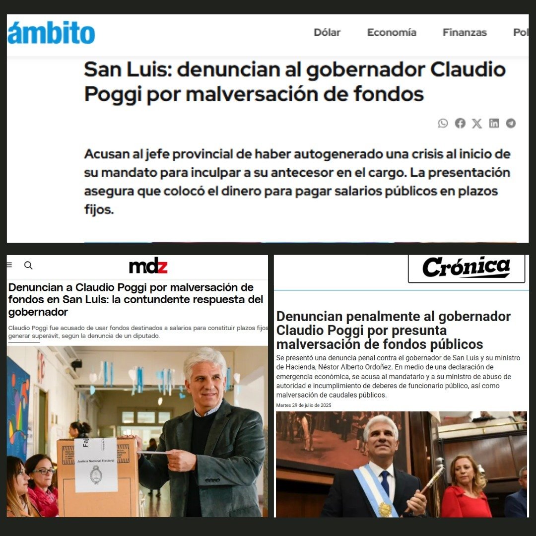 Desde Ámbito Financiero hasta Crónica, la noticia reventó las portadas. Ámbito lo tituló sin rodeos: «San Luis: denuncian al gobernador Claudio Poggi por malversación de fondos». Y Crónica, que no se quedó atrás, remarcó la acusación de «abuso de autoridad, incumplimiento de deberes y malversación de caudales públicos en medio de una declaración de emergencia económica».