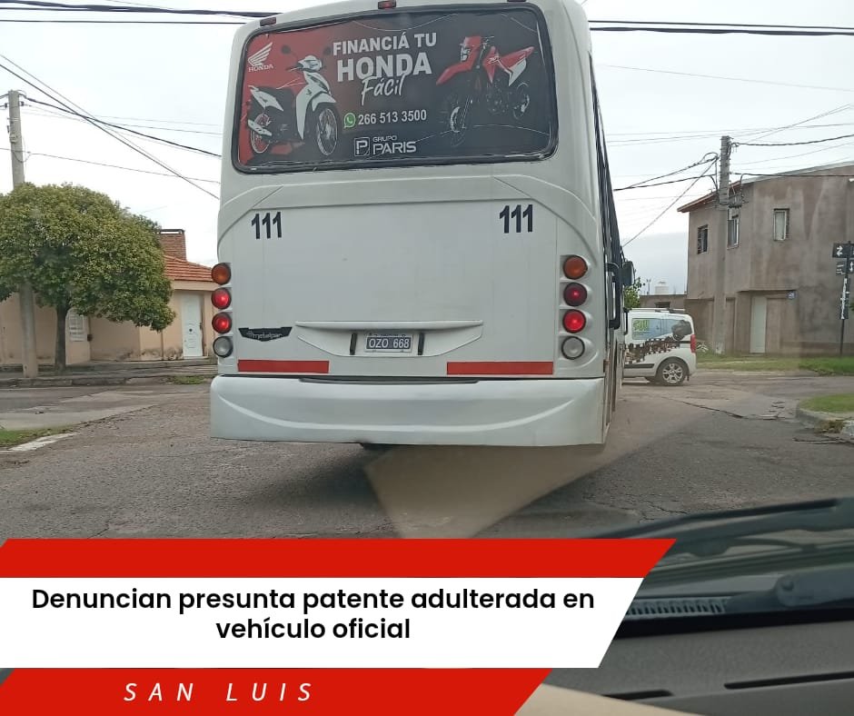 La irregularidad fue detectada mientras el colectivo realizaba su recorrido habitual por las calles de la capital puntana. Según las imágenes que circulan, la patente exhibida en la unidad interno 111 presenta inconsistencias que han despertado sospechas sobre su autenticidad.
