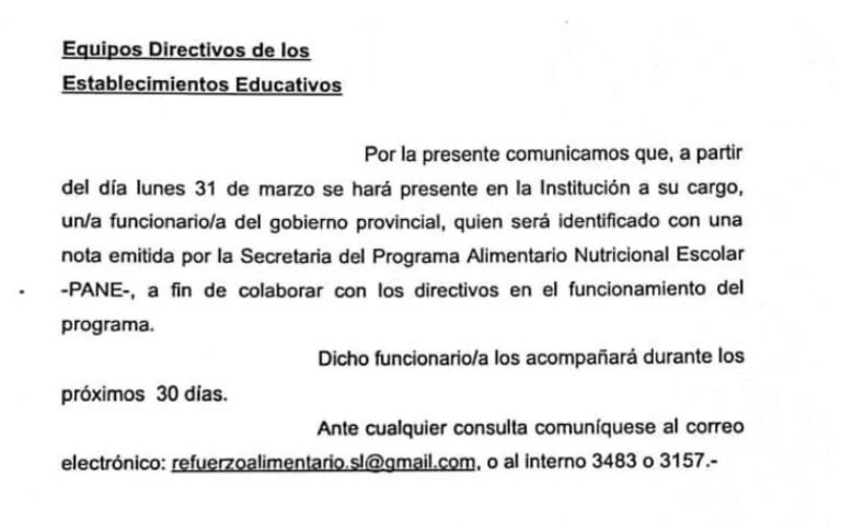 La primera acción adoptada por Eugenia Gallardo, coordinadora del PANE (un programa que adquirió rango de Secretaria de Estado y que es manejado por una candidata a diputada provincial en las próximas elecciones del 11 de mayo), ha sido designar funcionarios para “acompañar” la entrega de comida en los establecimientos educativos, tarea que deberán realizar por un periodo de treinta días. La medida rige desde este lunes.