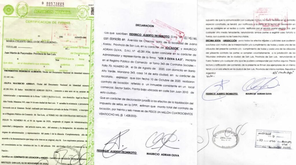 Según documentos municipales obtenidos por el medio, se confirmaría que Trombotto habría actuado “de ambos lados del mostrador” al alquilar directamente una propiedad suya, ubicada entre las calles San Juan y Esteban Adaro en la ciudad de San Luis, a la sociedad Las 3 Olivas S.A.S., cuyo titular es Mauricio Adrián Oliva, hijo de César Oliva, director de Valor Agregado y Vinculación Compre Local, dependiente del ministerio de Trombotto.