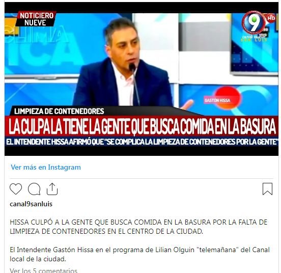 Una declaración muy desafortunada y triste pero que al mismo tiempo refleja tanto la inoperancia municipal como las consecuencias del modelo económico del poggismo. El intendente de San Luis, Gastón Hissa, dijo que el lamentable estado de los contenedores de la ciudad es culpa de la gente que busca comida.