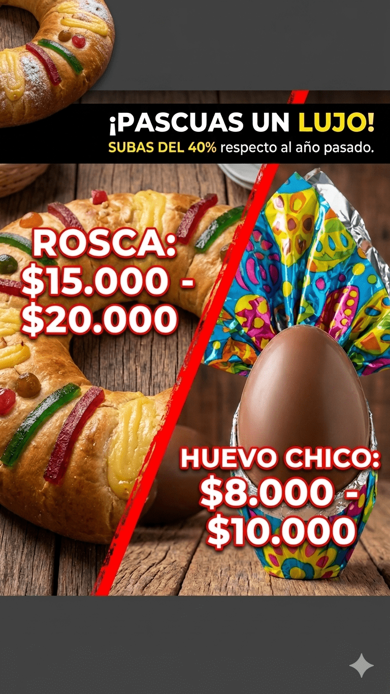 Los números asustan: una rosca cuesta entre $15.000 y $20.000, mientras que los huevos más chicos ya arrancan en los $8.000. El incremento en los insumos obligó a retocar los precios, pero los comerciantes advierten que las ventas caerán con fuerza ante la pérdida del poder adquisitivo.