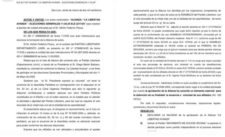 La Justicia Electoral Provincial estableció la nulidad de la aprobación de la alianza La Libertad Avanza. “La aprobación de la alianza ha carecido un elemento esencial para la obtención de su finalidad: la anuencia o voluntad de sus afiliados”, establece el dictamen.