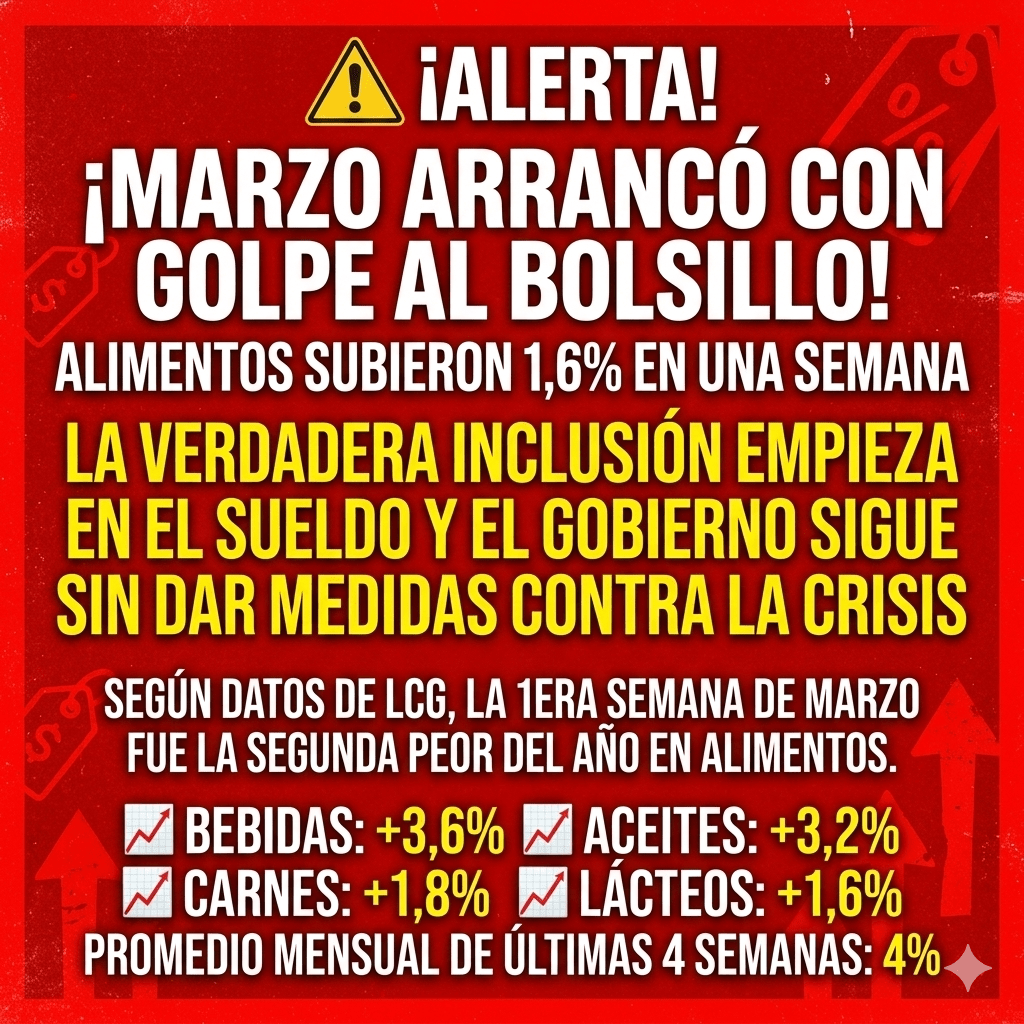 Mientras el Gobierno Provincial continúa de gira y sigue sin dar medidas contra la crisis, la realidad de las familias puntanas se cuenta en el ticket del supermercado. La primera semana de marzo registró la segunda suba más alta de todo el año en alimentos y bebidas, con un aumento del 1,6% en solo siete días.