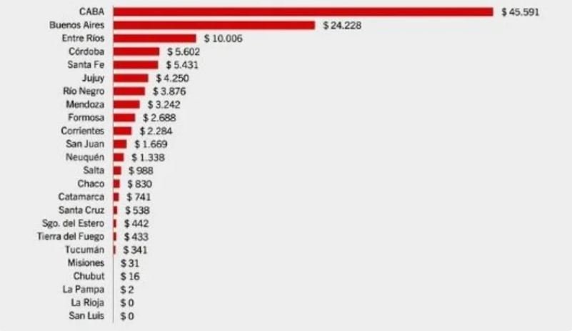 Río Negro recibió $3.876 millones, Mendoza $3.242 millones, Formosa $2.688 millones, Corrientes $2.284 millones, San Juan $1.669 millones, Neuquén $1.338 millones, Salta $988 millones, Chaco $830 millones, Catamarca $741 millones, Santa Cruz $538 millones, Santiago del Estero $442 millones, Tierra del Fuego $433 millones, Tucumán $341 millones, Misiones $31 millones, Chubut $16 millones, y La Pampa $2 millones.