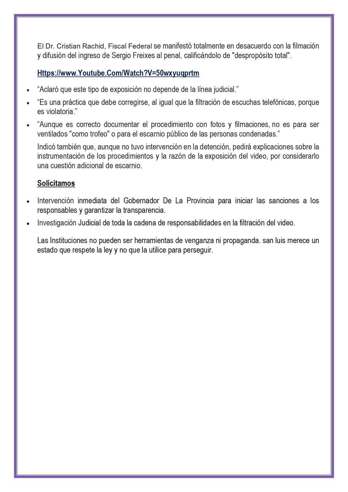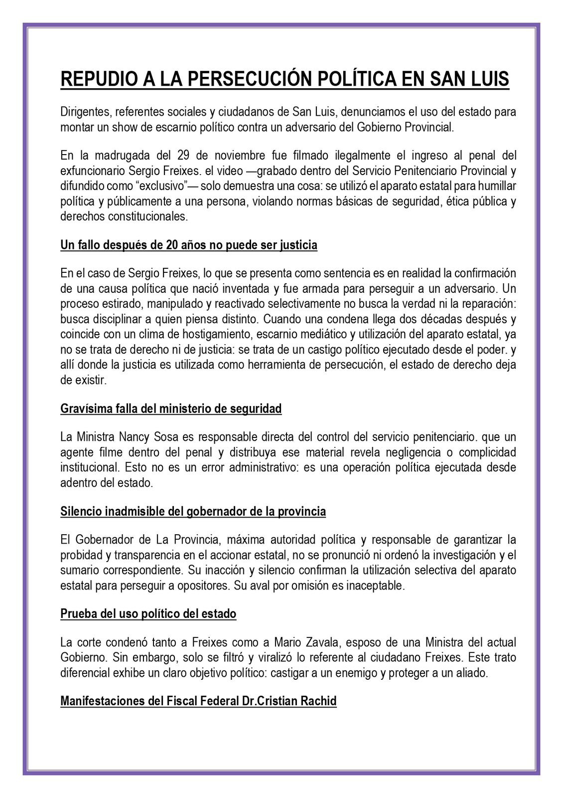 Dirigentes y referentes sociales denuncian que la condena contra el exfuncionario Sergio Freixes es un «escarnio político» y una «causa inventada» para hostigar a quienes disienten con el actual Gobierno. El Fiscal Federal, Dr. Cristian Rachid, calificó la filtración del video de Freixes en el penal como un «despropósito total» y una práctica violatoria, mientras exigen al Gobernador la inmediata sanción a los responsables.