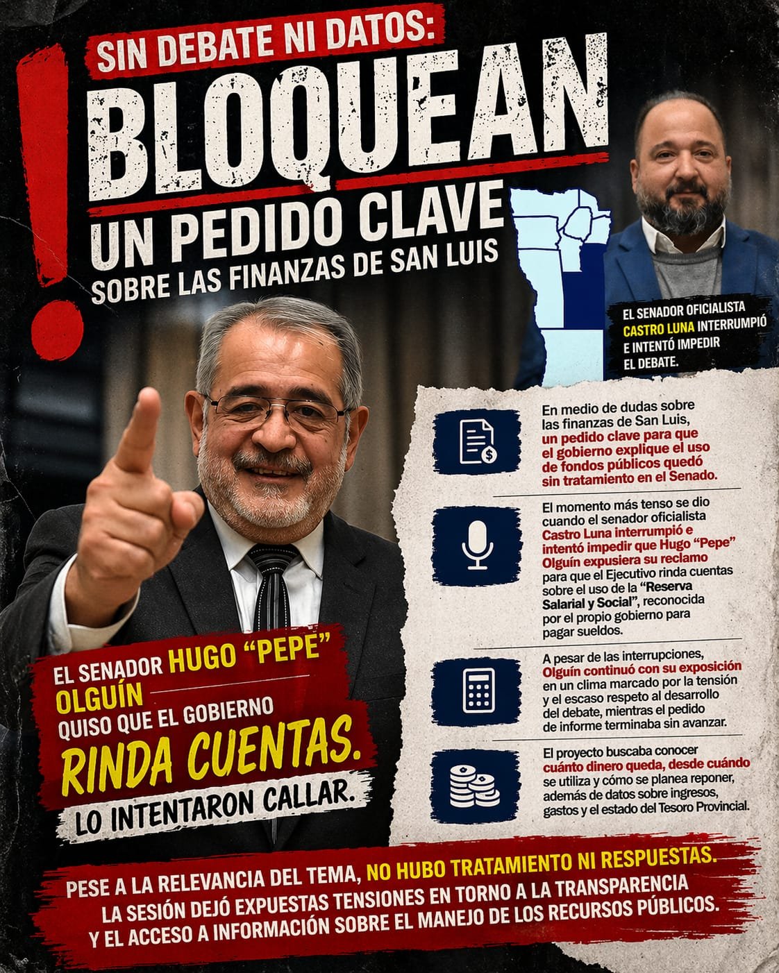 El momento más tenso se dio cuando el senador oficialista Castro Luna interrumpió e intentó impedir que Hugo “Pepe” Olguín expusiera su reclamo para que el Ejecutivo rinda cuentas sobre el uso de la “Reserva Salarial y Social”, reconocida por el propio gobierno para pagar sueldos. A pesar de las interrupciones, Olguín continuó con su exposición en un clima marcado por la tensión y el escaso respeto al desarrollo del debate, mientras el pedido de informe terminaba sin avanzar.