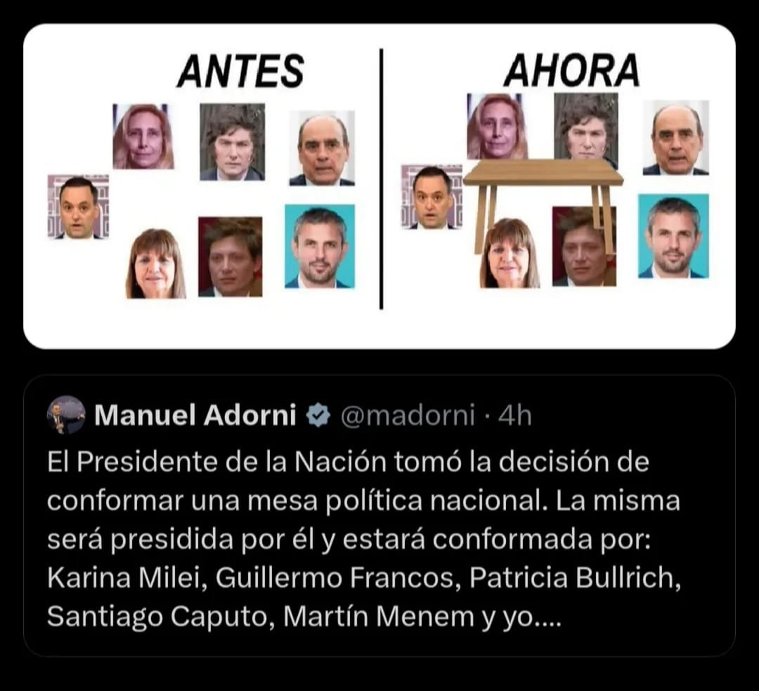 En esa mesa participarán también el jefe de Gabinete, Guillermo Francos, la ministra de Seguridad, Patricia Bullrich, el asesor presidencial, Santiago Caputo, y el vocero presidencial, Manuel Adorni. Así lo comunicó este último vía X, tras culminar la segunda reunión de Gabinete que se llevó a cabo durante la tarde en la Casa Rosada. Tendrán su debut este mismo martes a las 9.30 de la mañana.